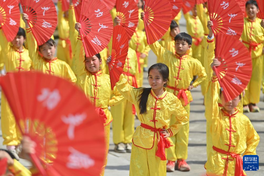 5月13日,学生在蒙山县文圩镇文圩中心小学练习功夫扇。