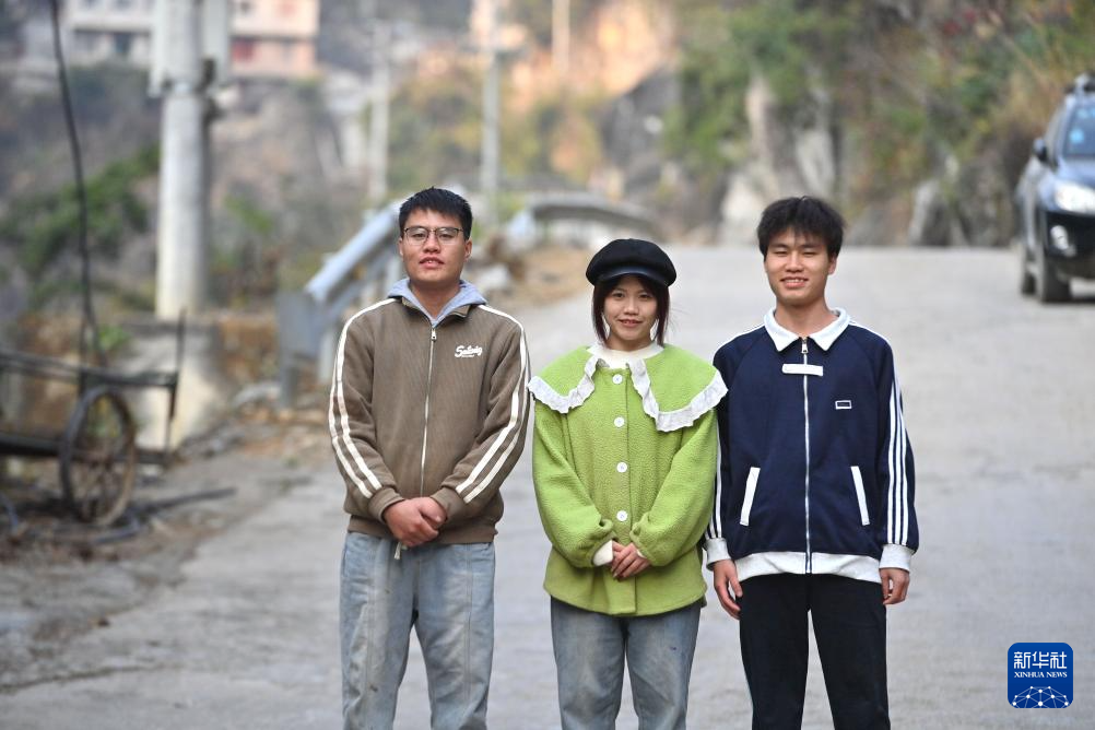在广西大化瑶族自治县板升乡弄雷村,村医蒙富松(左)和弟弟妹妹合影(2025年1月20日摄)。蒙富松的弟弟妹妹目前正在读大学。