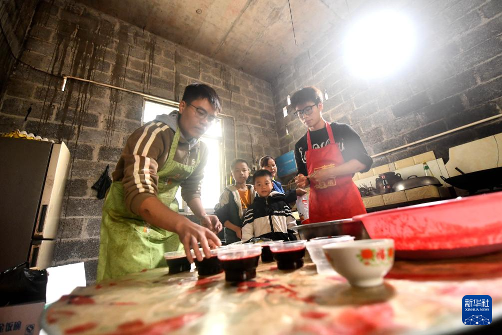 在广西大化瑶族自治县板升乡弄雷村,村医蒙富松(左一)在家准备晚饭(2025年1月20日摄)。