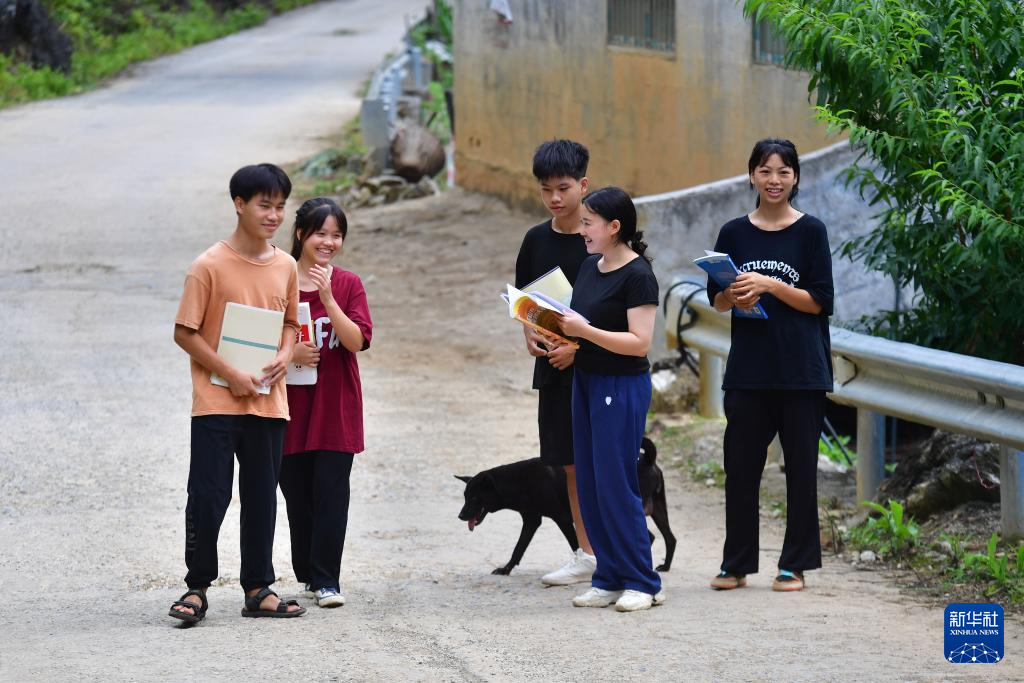 在广西大化瑶族自治县板升乡弄雷村哈宝屯,放假回家的蒙秋艳(右二)和小伙伴们一起交流(2022年8月23日摄)。