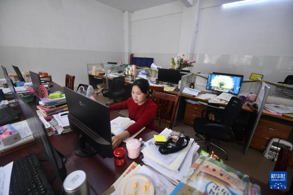 蒙秋艳在广西大化瑶族自治县板升乡初级中学的办公室备课(2025年5月27日摄)。