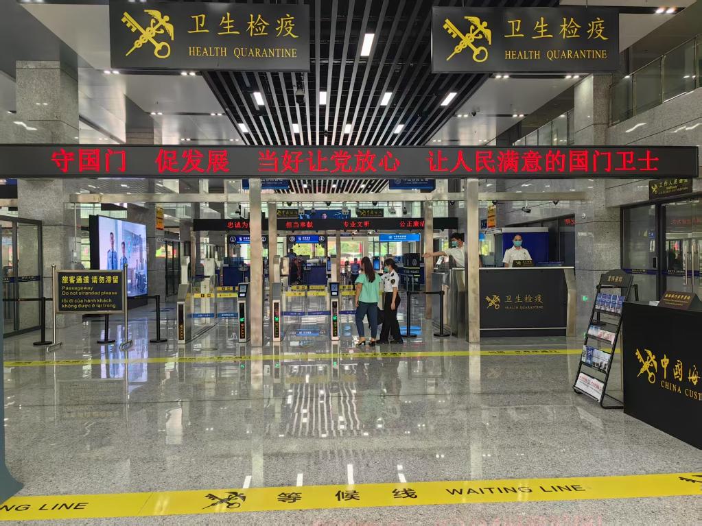 这是峒中海关关员引导出境旅客接受海关检查。(劳虹宇 摄)