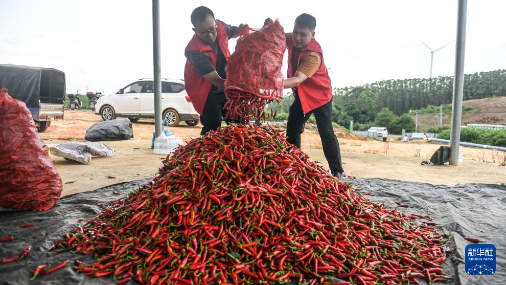 6月12日,在钦州市钦南区沙埠镇油埠村,两名志愿者在堆放农民收获的辣椒。