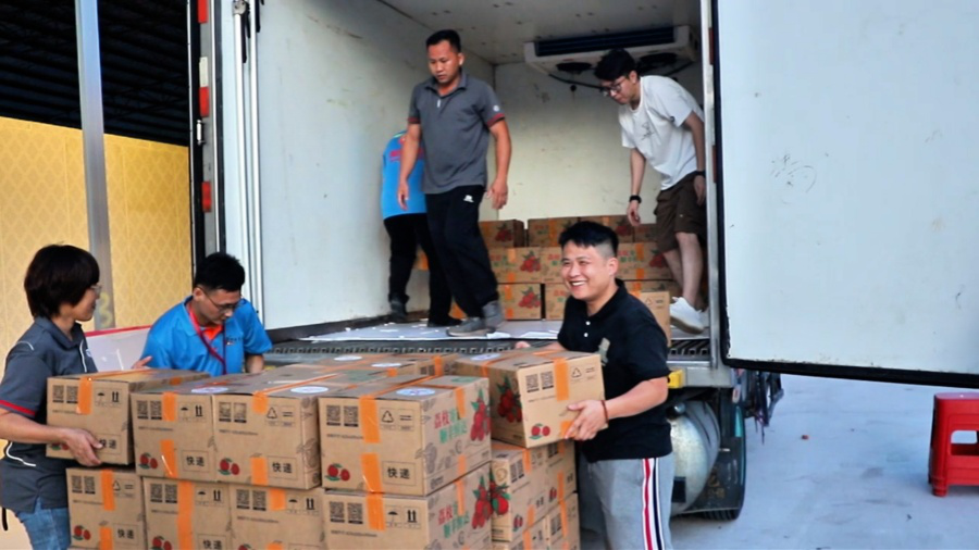 近日,广西贵港桂平市麻垌荔枝品牌联合体集配中心一派繁忙景象,工人们正忙着分拣、打包一颗颗红艳饱满的荔枝。这批麻垌荔枝即将搭乘冷链车,跨越1600公里,直抵河南万邦国际交易市场。