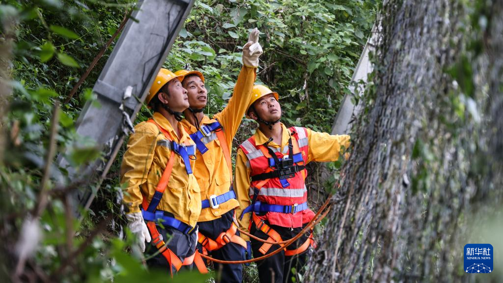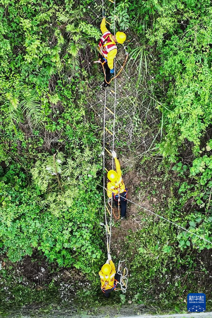 桥隧工人巡查隧道顶部的被动网(7月15日摄,无人机照片)。