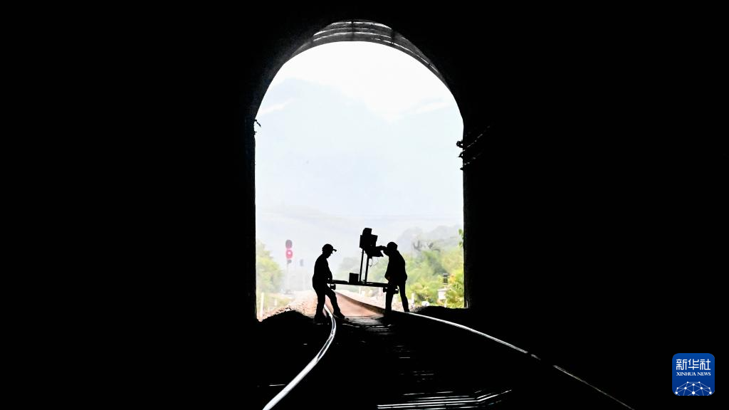 桥隧工人检查隧道内铁轨(7月16日摄)。