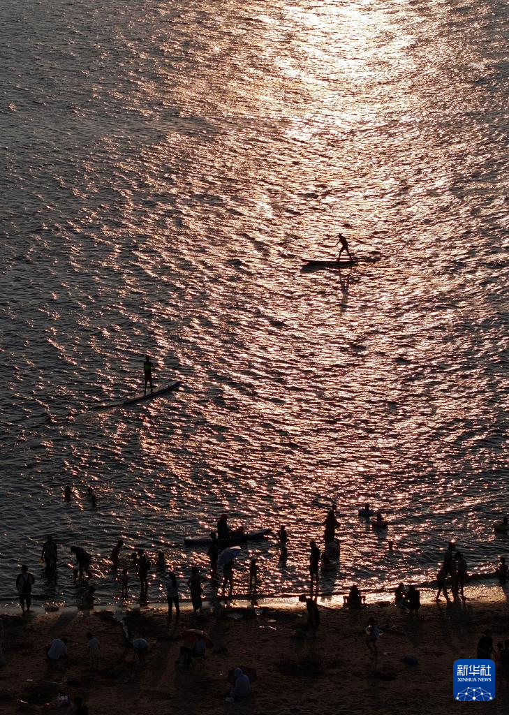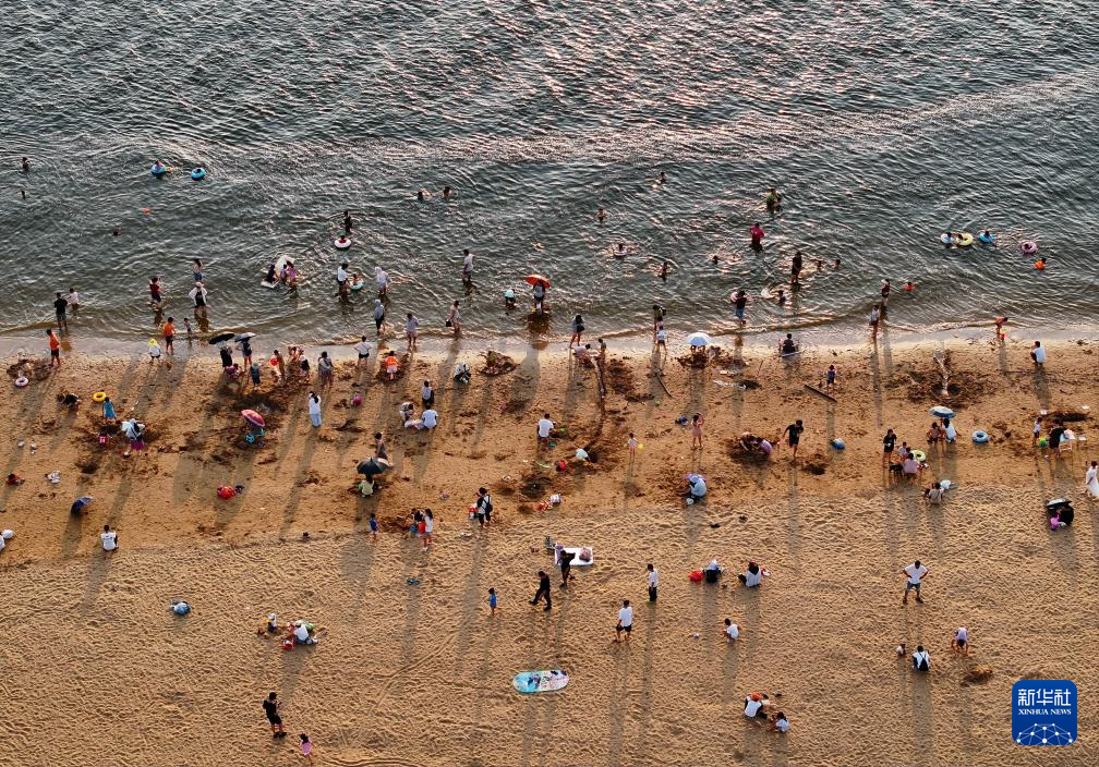 市民和游客在防城港市西湾旅游景区沙滩浴场游玩(7月6日摄,无人机照片)。