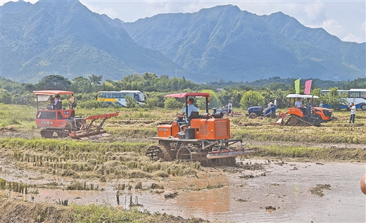 智能化高速插秧机、水稻智能有序抛秧机、电动水稻插秧机、自走式水田深施肥机、植保无人机、自走履带式谷物联合收割机及轻简型再生稻联合收获机等机具现场演示,十分抢眼。