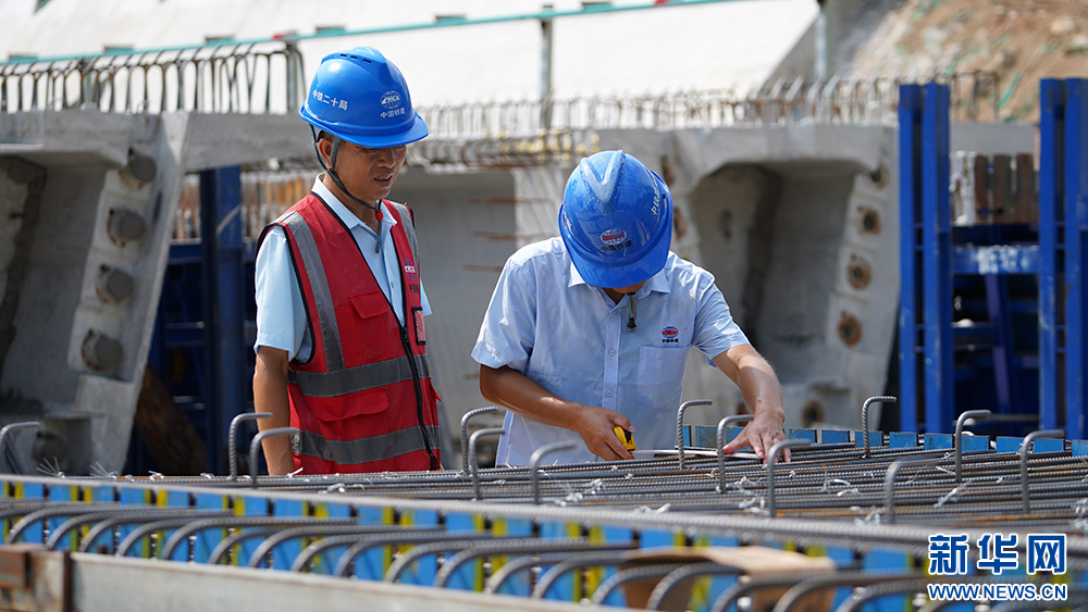 中铁二十局的工作人员在广西鱼宜高速项目二号梁场检查施工情况。