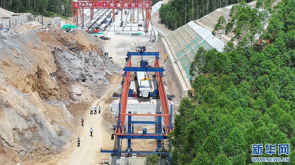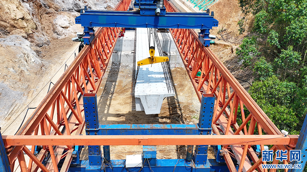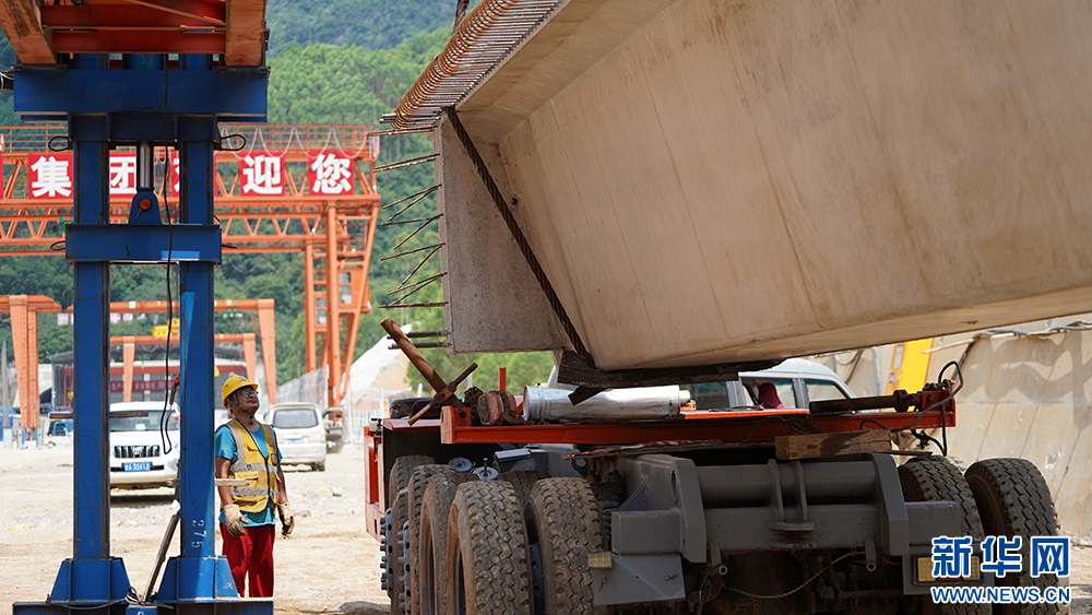 中铁二十局的工人在广西鱼宜高速项目二号梁场架设第一片箱梁。