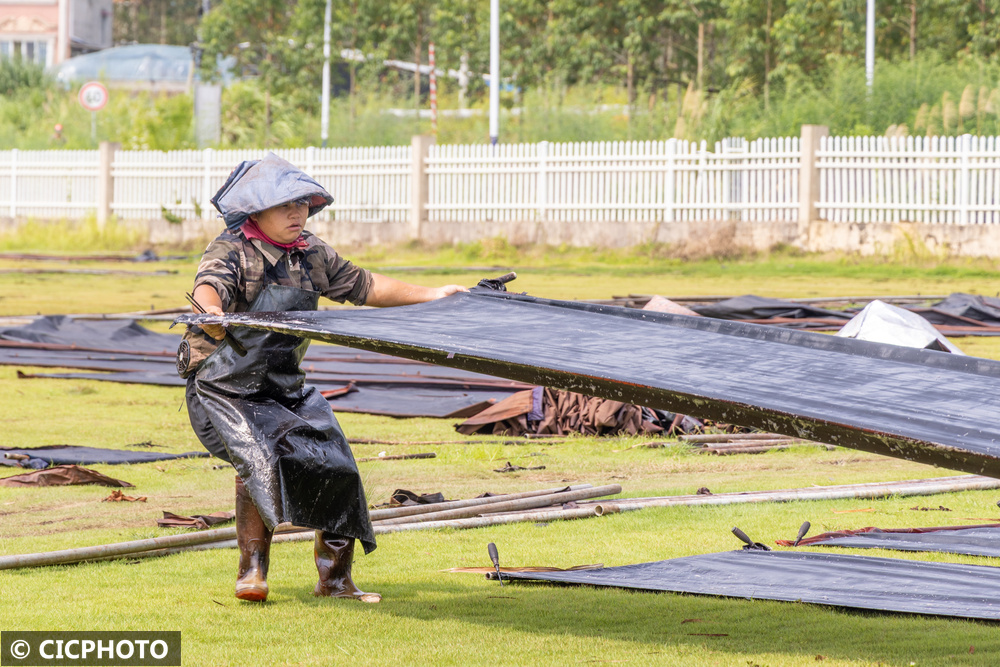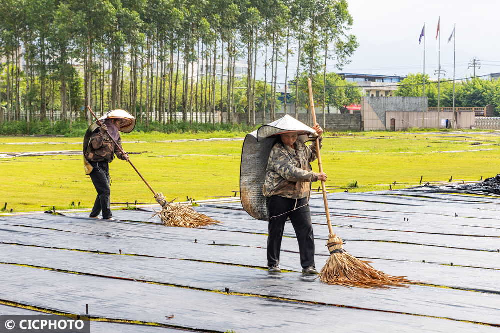 ↑2025年7月30日,在广西梧州市蒙山县一家丝绸企业的晒坪内,工人在清理晾晒的香云纱上的积液。CICPHOTO/黄胜林 摄