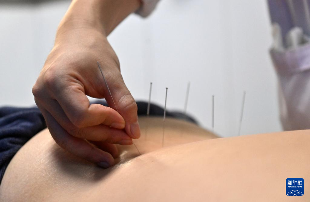 8月9日,在广西南宁市青秀区方园社区卫生服务中心,医务人员在给市民做针灸。