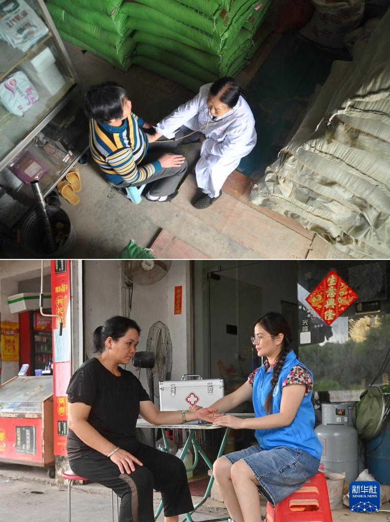 这是一张拼版照片。上图:在广西南宁市高岭村,杜桂梅医生(右)入户为村民检查身体(2011年12月7日摄)。下图:潘雪梅医生(右)入户为村民检查身体(2025年8月18日摄)。