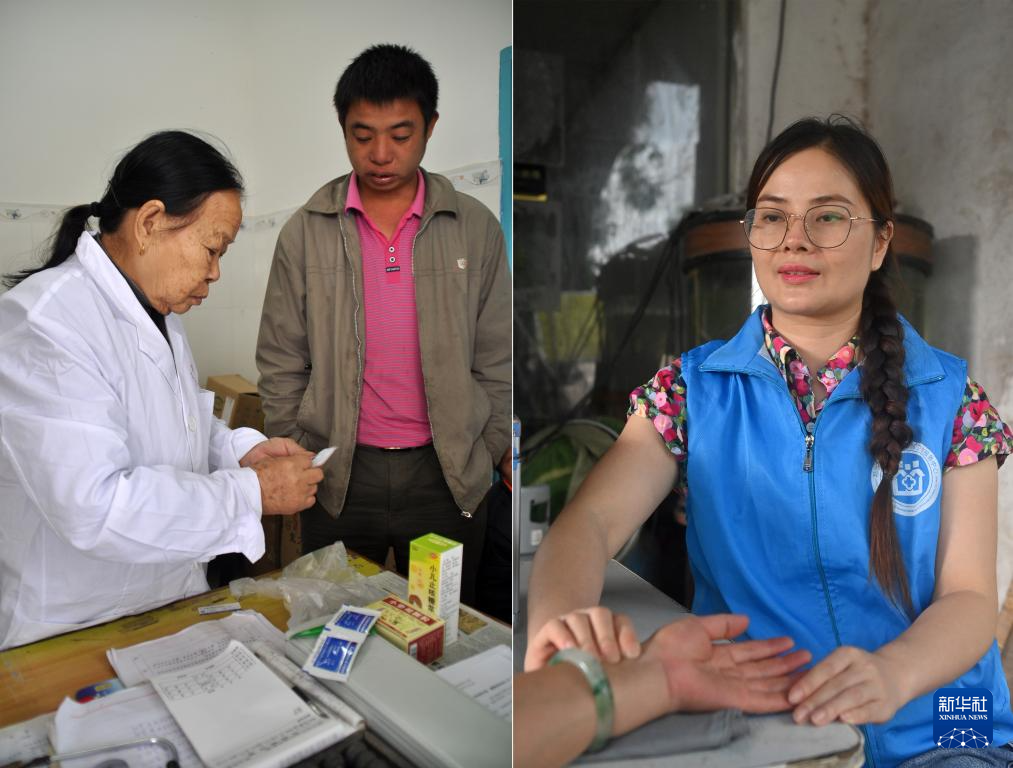 这是一张拼版照片。左图:在高岭村卫生室,杜桂梅医生向村民交代用药注意事项(2011年12月7日摄)。右图:潘雪梅医生入户为村民把脉看病(2025年8月18日摄)。