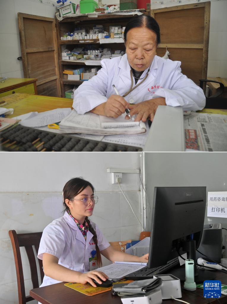 这是一张拼版照片。上图:杜桂梅医生在高岭村卫生室为病人手写处方(2011年12月7日摄)。下图:潘雪梅医生在高岭村卫生室用电脑录入病人信息(2025年8月18日摄)。