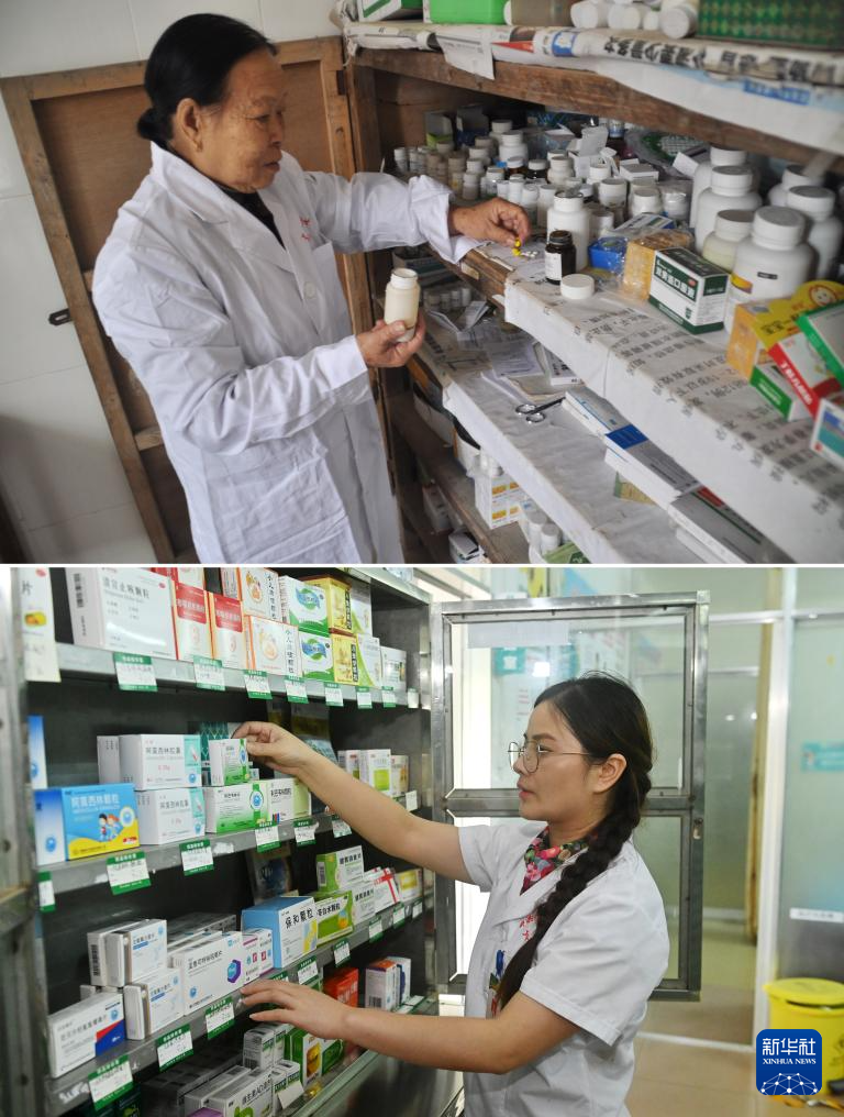 这是一张拼版照片。上图:杜桂梅医生在高岭村卫生室为病人配药(2011年12月7日摄)。下图:潘雪梅医生在高岭村卫生室为病人找药品(2025年8月18日摄)。