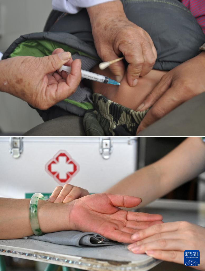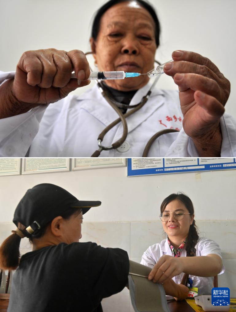 这是一张拼版照片。上图:杜桂梅医生在高岭村卫生室给村民打针(2011年12月7日摄)。下图:潘雪梅医生在高岭村卫生室为村民把脉看病(2025年8月18日摄)。