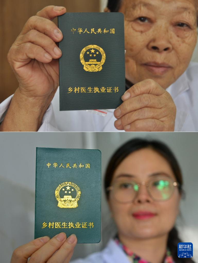 这是一张拼版照片。上图:杜桂梅医生在高岭村卫生室展示自己的乡村医生执业证书(2011年12月7日摄)。下图:潘雪梅医生在高岭村卫生室展示自己的乡村医生执业证书(2025年8月18日摄)。