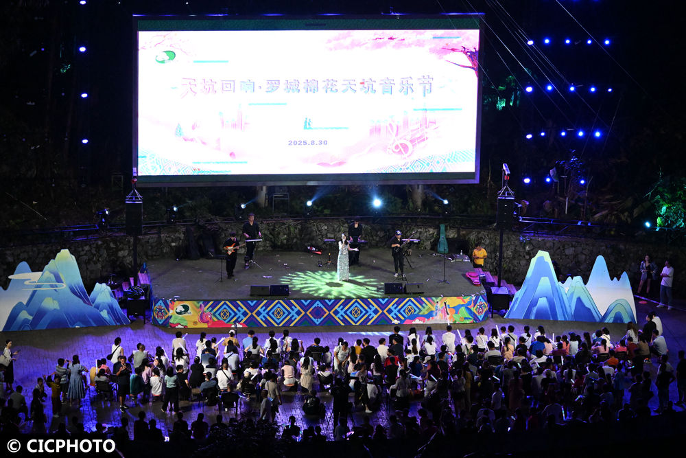 ↑2025年8月30日,游客在广西河池市罗城仫佬族自治县棉花天坑景区观看音乐表演。CICPHOTO/韦如代 摄