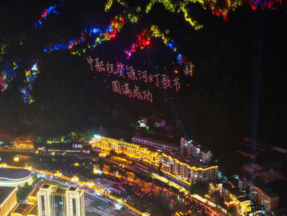 无人机镜头下的河灯点缀资江河面