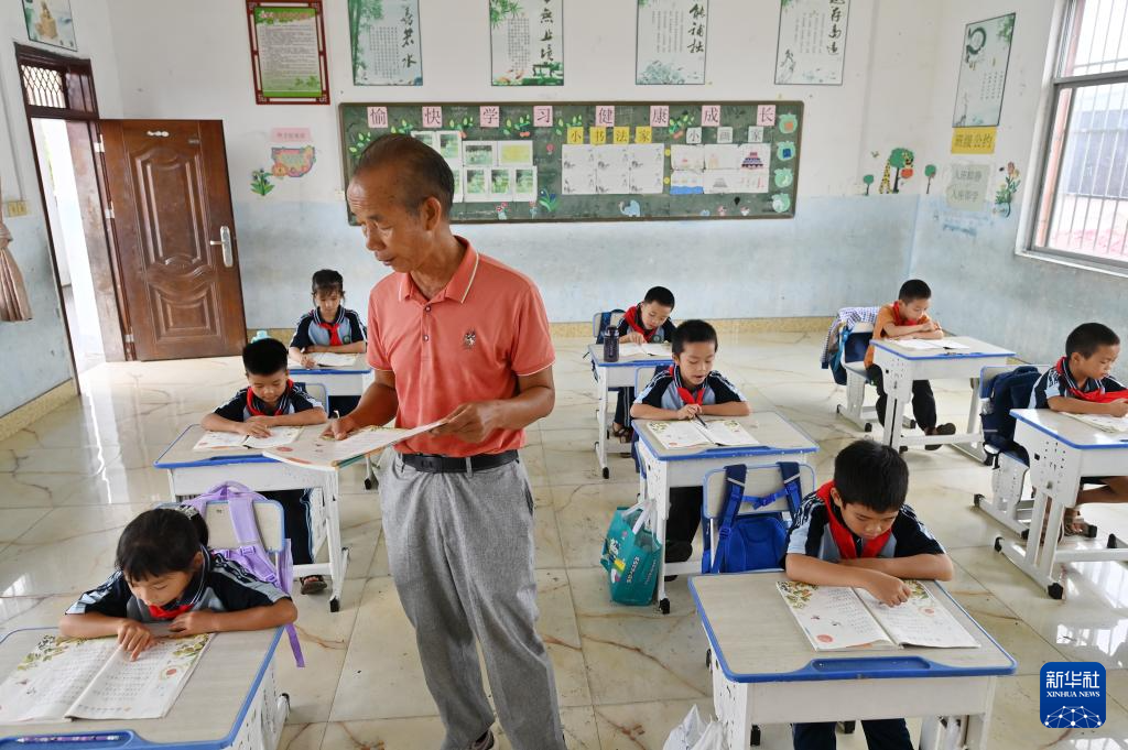 9月9日,在广西宾阳县王灵镇中心学校七新教学点,王英红老师在给学生上课。