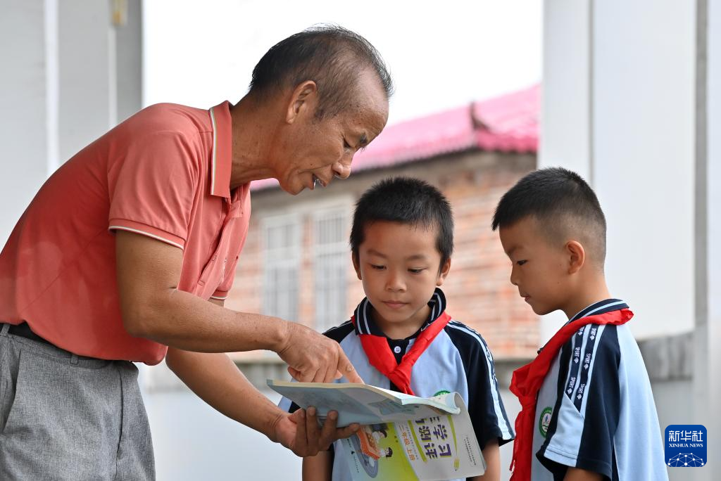 9月9日,在广西宾阳县王灵镇中心学校七新教学点,王英红老师在课间辅导学生功课。