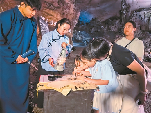 游客在七星岩体验书写抗战标语。 广西云-广西日报记者黄海健/摄
