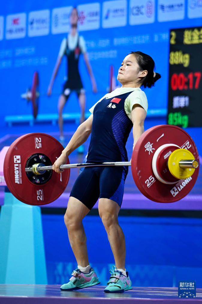 11月10日,广西队选手赵金兰在抓举比赛中。