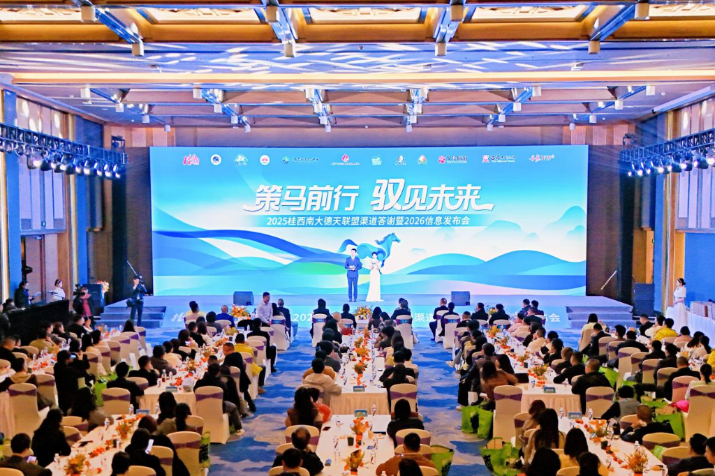 新华网南宁1月14日电(闭秀玉)1月13日,以“策马前行·驭见未来”为主题的2025桂西南大德天联盟渠道答谢暨2026信息发布会在广西南宁举行。行业达人、旅行社代表、线上OTA分销商、桂西南全国渠道外办及导游代表等300余名嘉宾共襄这场文旅行业盛会。