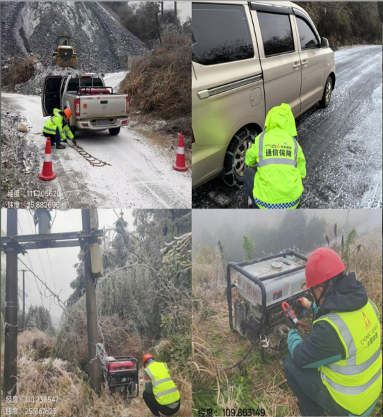 闻雪而动踏冰前行。桂林市全州县、龙胜县、资源县等山区出现道路结冰及设施覆冰情况,桂林铁塔迅速行动,克服道路积雪结冰、行车受阻等重重困难,第一时间对易遭受雨雪冰冻灾害点位的光缆、机房、基站等通信设施进行供电、积雪、冰冻物等情况的全面巡检,及时赶赴受损站点,全力做好通信保障工作。柳州融水苗族自治县同练乡大蒙基站无线机房突遇停电险情,因严寒导致高压线路覆冰下垂,触碰周边树木造成短路。面对冰雪封路、坡陡路滑的极端环境,柳州铁塔的抢修队伍迎风踏雪而行,在冰凌遍布的山路间争分夺秒地清理树障、修复线路,经紧张有序的作业,线路隐患被彻底清除,基站供电平稳恢复。