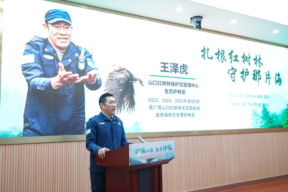 广西山口红树林生态国家级自然保护区管理中心生态护林员王泽虎讲述了守护“海上森林”的故事,他每年巡护超260天,累计里程逾5000公里,凭借细致观察多次制止破坏生态环境的行为。同时,他还做好政策宣教的“讲解员”,将2500多份宣传材料送到群众手中,坚守“生态保护无小事”的信念。