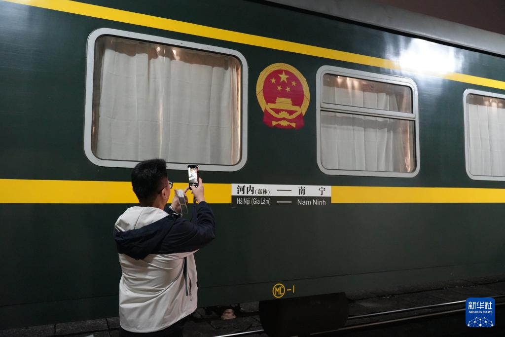 2月10日,在越南河内嘉林站,一名旅客在中越国际联运旅客列车前拍摄列车标志。