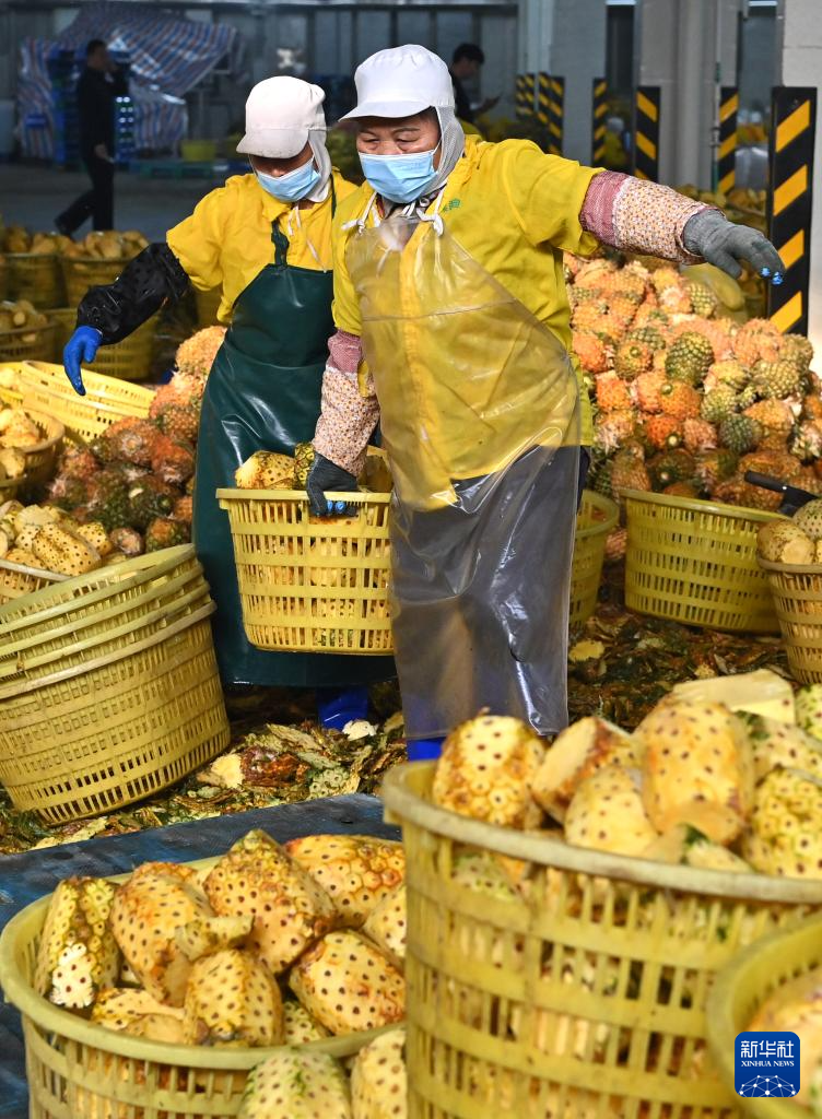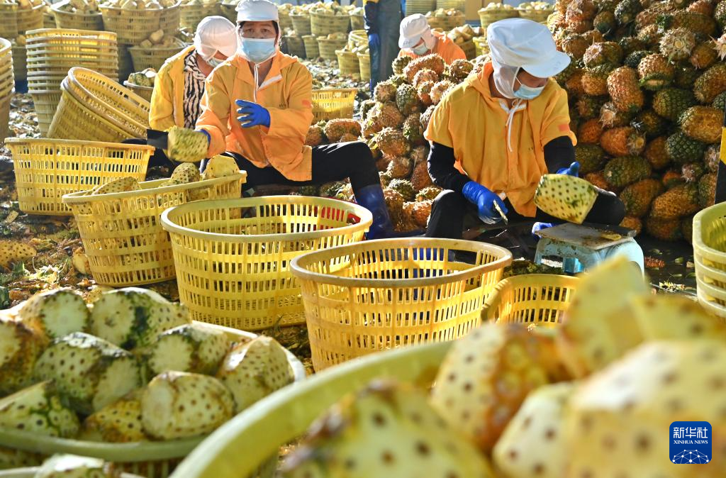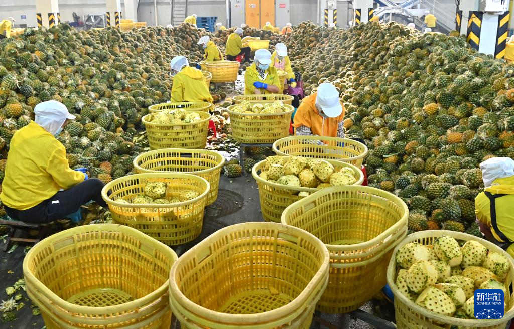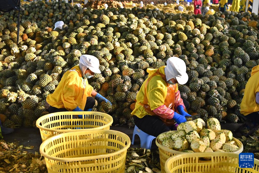 时下正值菠萝陆续成熟上市时节,广西合浦相关加工企业的工人加紧加工处理刚采收的菠萝,生产一线一派繁忙景象。