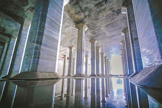 如今,漫步在马道枢纽省水池已然成形的“地下森林”,只见巨柱静立如椽,重重柱影在幽深的光线中纵横交错,令人仿佛走进科幻电影《盗梦空间》中的神秘幻境。
