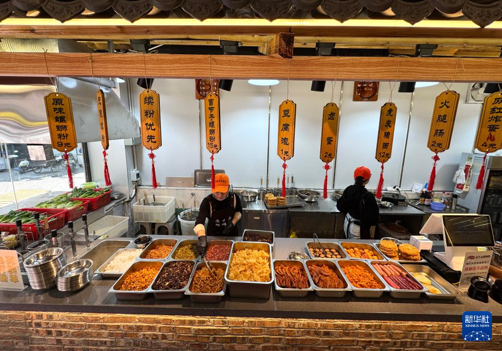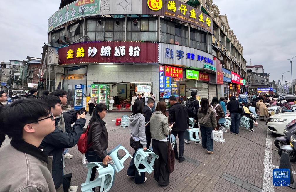 游客在广西融水苗族自治县融水镇新国村一家螺蛳粉店排队购买螺蛳粉(2026年3月7日摄)。